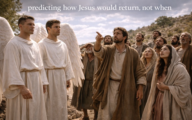 1. First … the angels were not predicting WHEN, they were predicting HOW Jesus would return to earth: Jesus will come back in the same way you have seen Him go into heaven.” (Acts 1:11)
