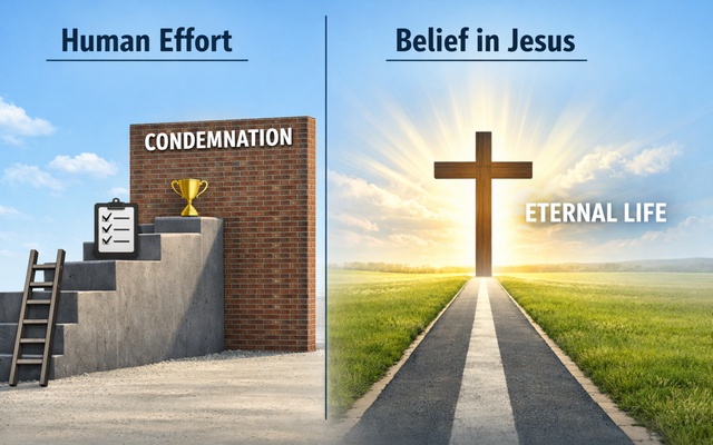 What? Belief not effort is the key to heaven. And belief in ONE particular person, God’s one and only Son? Wow, that’s very restrictive, isn’t it? In fact, that eliminates almost every common and popular opinion, theory and even religious program for gaining acceptance into the kingdom of God, doesn’t it?