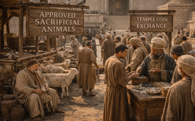 Because so many people had come from so far there was a very good business to be had by selling sacrificial animals, which had been approved by the religious elite, and also the exchanging of money from whatever currency the travelers used to the temple coin, which was minted especially and only for use at the Temple.