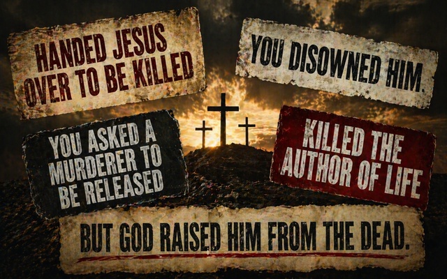 Next Peter went right at the crowd: “You handed Jesus over to be killed, and you disowned Him before Pilate, though Pilate had decided to let Jesus go. You disowned the Holy and Righteous One and asked that a murderer [Barabbas] be released to you. You killed the author of life, but God raised Him from the dead. We are witnesses of this…” (Acts 3:13-15) Pause. Which of those several accusations by Peter do you think was most impactful that day to the Jewish crowd?