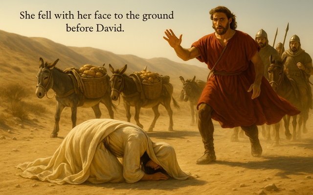 As you see in 1 Samuel 25:18-22 Abigail acted quickly and wisely. She gathered up some food and urged the servant to lead her quickly to David before it might be too late and disaster may strike. As she approached David she apologized for her husband’s bad behavior. She thanked David and his men for their faithful protection of she and her husband, their flocks and workers. And she offered to David food which she had brought them. So, she also urged David to NOT take revenge on her foolish husband. Abigail then pronounced a prophetic blessing over David:  “The LORD your God will certainly make a lasting dynasty for my Lord, because you fight the LORD’s battles, and no wrongdoing will be found in you…” (1 Samuel 25:28-31)