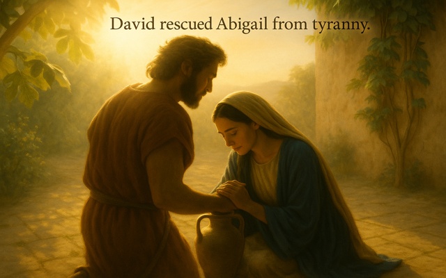 This amazing story concludes with David, once hearing about the death of Nabal, inviting Nabal’s widow Abigail to come and join David’s family as his wife. You’ll remember we’ve seen the powerful truth of the Israel concept of “kinsman redeemer”, but this is David potentially rescuing Abigail from living any longer under the tyrannical domination of Nabal’s family and coming instead into David’s household as David’s wife.
